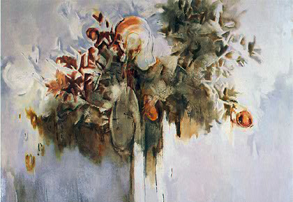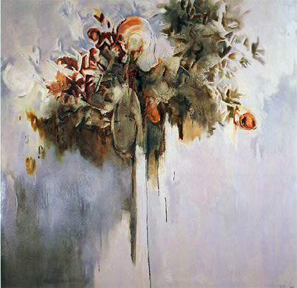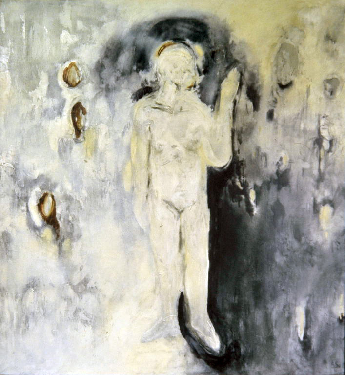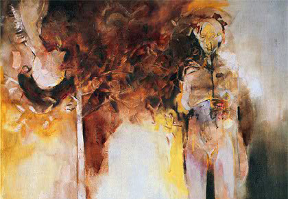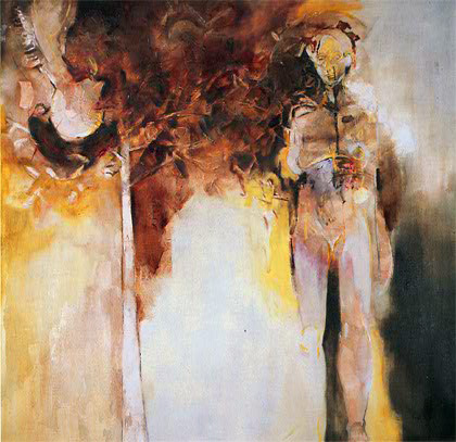 Se abona con el análisis, pero se paga con emoción. Destaco en este cúmulo de emociones que se confunden con las sensaciones y con las deducciones algunos de los motivos más significativos, aunque no tenga caso adelantar las cosas que nada más habrán de ser visitas. Los dos autorretratos son muy interesantes. A mi me sugieren, aunque no tienen nada que ver, la manera de abordar el modelo que tenía Giacometti, no sé por qué. Una disección longitudinal, ejercicio totalmente imaginario, sin espejo que refleja la visión interior que el artista tiene de sí mismo. El segundo autorretrato hace una síntesis del anterior. Hay un "Bosque" como salido de una ensoñación y un "Adán y Eva" en que se aúnan el bosque y el cuerpo y que me recuerda vagamente a Cranach. Pero para mi de todas estas pinturas, la que más me mueve a sentir y a pensar es la figura de ese "Árbol" (Wholenes) en el que están concretadas todas las posibilidades del orden canónico que rige por igual a la forma de la mano que a la del árbol...