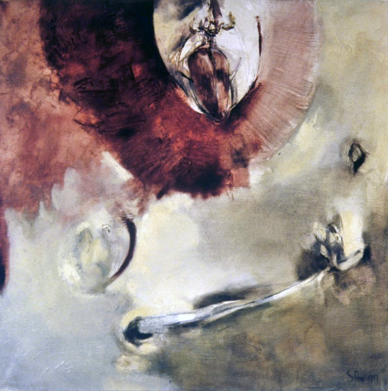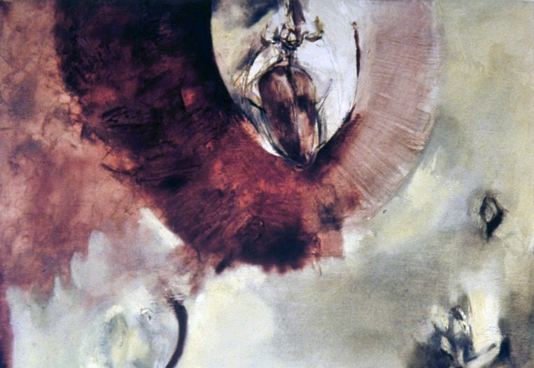 El cuerpo, concebido como idea, propone casi siempre la idea de abismo o de cima, como si fuera una cosa disociable racionalmente y comprensible en los términos en que se entiende "lo animal ", es decir, lo que está animado de movimiento o de vida. El movimiento de una planta es de acción miníma y de intensidad máxima, es por eso que estas pinturas son tan interesantes. Representan ese punto en que el movimiento y la vida se equilibran como formas expresivas y son patromonio único, más del artista que del anátomico. Todas las formas o cosas se dirigen hacia su inteligencia: hacia la "formación" de un todo comprensible y orgánico, pero no en un orden que escapa a la inteligencia y que se oculta de alguna manera, a su condición de documento acerca de la respuesta del movimiento que se oculta, de alguna manera, a su condición de documento acerca de la respuesta del movimiento que se oculta a la razón y que actúa predominantemente en e orden de las sensaciones. El vértigo que produce el vórtice o la sensación de abismo ante la cosa abierta en canal, desmembrada, expuesta en su organización esencial, pero sin señalamientos indicativos que nos dicen exactamente de lo que se trata. En el arte es fuerza que la documentación sea más emotiva que la forma misma que expresa la emoción.